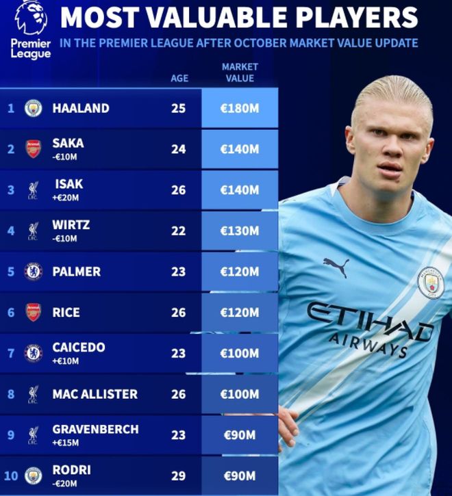 近期德转更新了英超球员的最新身价,而英超在夏窗引进了大量的高身价球员,20支球队的身价全部在2亿欧元以上,这在五大联赛完全是独一档,而英超身价排在前十的球员,他们的实力更是无人能及。在这10人当中,有4个人都是利物浦的,其中包括伊萨克、维尔茨两名新援,以及麦卡利斯特和赫拉芬贝赫。不过利物浦的这四个球员都不是最高身价,英超第一身价是来自曼城的超级神锋哈兰德,本赛季英超联赛开赛以来,哈兰德在7场比赛打进9粒进球,他的全面性无人能及,即便是姆巴佩在门前的冲击力也无法和哈兰德媲美。在这十人当中,身价下滑最严重的是罗德里,他的身价从1.1亿欧元降到9000万欧元,但罗德里是因为上赛季重伤才导致身价严重下滑,其余两名身价下滑的是萨卡和维尔茨,他们的身价都下滑了1000万欧元,然而以维尔茨当前在英超的表现,他的身价或许还会继续下滑。在这份英超身价榜单中,最被低估的球员就是赫拉芬贝赫,德转给他的身价是9000万欧元,但几乎所有人都知道,哪怕是给利物浦1亿欧元,也别想轻易把赫拉芬贝赫从利物浦带走。从目前利物浦的表现来看,利物浦的四名入选球员中只有赫拉芬贝赫还能表现出和身价相符的表现,麦卡利斯特、维尔茨和伊萨克都没有1亿欧元以上的表现。作为利物浦上赛季的中场大腿,麦卡利斯特的表现也和上赛季有较大的区别,由于速度不够快,麦卡本赛季总是在中场被对手围抢,无论是转移球还是防守都很迷茫,这或许就是斯洛特经常不让他踢满全场的根本原因。比起其他的队友,伊萨克的身价足足上涨了2000万欧元,这完全是按照上赛季的表现来定的,如果按照本赛季到目前为止的表现,伊萨克的身价完全有可能降到1亿欧元以下。作为英超总身价排在联赛第三的球队,利物浦在10月的表现完全配不上他们的身价,在国际比赛日之后,希望斯洛特能带领球摆脱低迷的状态,重新成为争冠热门球队。