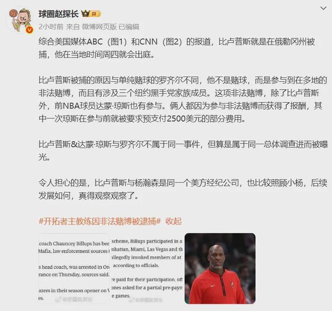 出大事了,闹翻天了。开拓者主帅比卢普斯因参与非法赌博被逮捕,该案件还涉及黑手党的非法扑克经营。比卢普斯刚执教完杨瀚森第一场常规赛比赛就出事了......目前暂时不能确定比卢普斯的命运会如何?但可以肯定未来很长一段时间都看不到他出现在NBA赛场,开拓者正在紧急寻找其的替任者,毕竟赛季正在进行军中一日不可无帅。比卢普斯非常看重杨瀚森,并且对他有着长期的培养计划,而开拓者新帅对我们这位中国球员的态度如何则是未知数,所以大家就很担心杨瀚森的NBA生涯会受此影响。对了,青岛队主帅&杨瀚森恩师刘维伟正在美国,要不开拓者考虑下.手动狗头。比卢普斯出生于1976年9月25日,今年49岁,1997年的探花秀,NBA球员生涯长达17年薪资总收入约1.07亿美元,03-04赛季带领活塞拿到总冠军个人荣获FMVP,21年开始担任开拓者主帅直至现在,本来都实现了名利双收如今却搞到身败名裂。据FBI(美国联邦调查局)官方宣布,他们在此次行动中总共逮捕30人,其中有3名跟NBA有关,就比卢普斯、罗齐尔(热火现役后卫)和达蒙-琼斯(退役球员),其余均来自全美各地的犯罪家族。罗齐尔是因参与体育博彩赌博被FBl逮捕,有新闻报道他曾向投注者透露轮换信息以及在某场比赛进行到仅9分钟时就装病等等从而谋取利益,一旦这些罪名坐实就可以宣告他的NBA生涯结束。不完全统计,迄今为止的罗齐尔NBA生涯总薪资高达1.6亿美元,但他还去赌球,终究因胃口太大把自己撑死了,自作自受没什么好同情的。最新消息显示,NBA官方已经勒令比卢普斯和罗齐尔立即从所属球队离职。刚开赛就闹出了一大波惊天丑闻,想必不少人正在被窝里瑟瑟发抖。“当屋子里发现有一只蟑螂时,那么肯定不止这一只。”