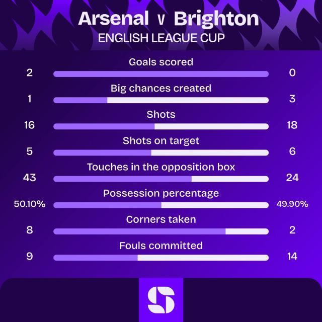 阿森纳首发:凯帕/本·怀特(70'于里恩·廷伯),克里斯蒂安·莫斯克拉,因卡皮耶(70'加布里埃尔·马加良斯),刘易斯-斯凯利/恩瓦内里,内尔高,梅里诺/道曼(71'萨卡),哈里曼-安努斯(77'赖斯),埃泽(83'特罗萨尔)【数说】15岁302天-出生于2009年12月31日的道曼以15岁302天的年龄成为阿森纳队史最年轻的首发出场的球员。6-阿森纳是第一支单月6场比赛全部取胜且未丢一球的英超球队。10-恩瓦内里在本场比赛中打入了自己在阿森纳一线队的第10粒进球。