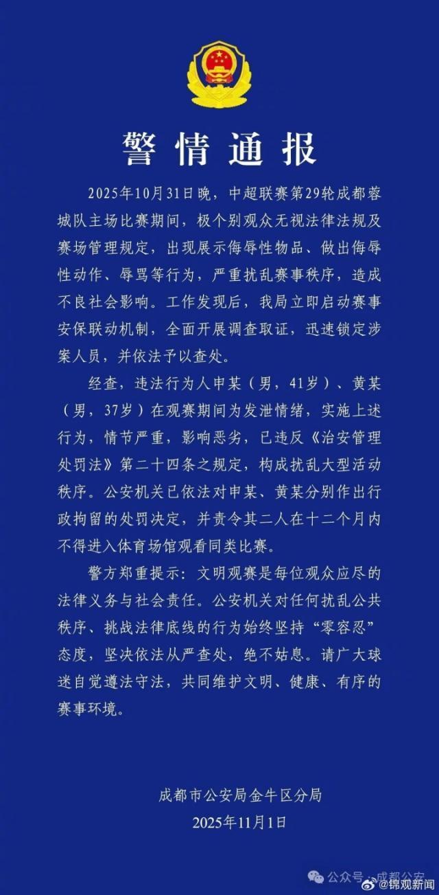 11月01日讯 成都市公安局金牛区分局通报,2名球迷观战蓉城vs河南时,出现展示侮辱性物品、做出侮辱性动作、辱骂等行为,已被行政拘留。现役F1车手分站冠军榜:汉密尔顿105次遥遥领先,诺里斯上双