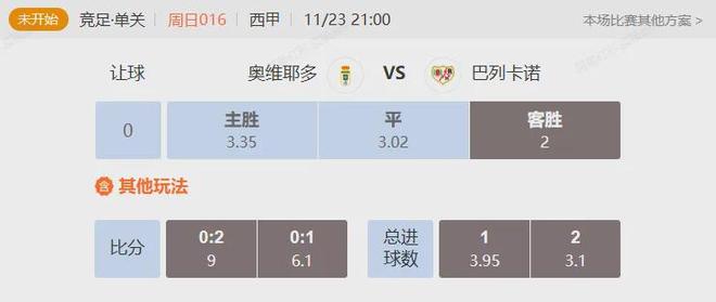网易红彩今日挑选专家李俏洋带来一场西甲赛事解析,更多精彩方案可下载“网易红彩”App进行查阅!1.专家:李俏洋竞足 周日016西甲奥维耶多VS巴列卡诺开赛时间:2025-11-23 21:00:00皇家奥维耶多作为升班马,在西甲立足还是有些困难,12轮过后2胜2平8负,只拿到8分,保级压力相当巨大,防守端的问题远没有进攻端的乏力严重,球队12轮仅收获7个进球,新帅卡里翁走马上任也没能改善球队目前的处境。同时球队近4个联赛主场1平3负,并且近3个主场一球未进,这种主场难有优势可言。而巴列卡诺虽然排在第14,但是距离欧冠区也只有5分的差距,球队在有欧战任务的情况下并没有被拖垮,反倒是踢得相当有信息,上一轮主场面对皇家马德里,并没有龟缩防守而是跟西甲豪门打对攻,最终收获了一场有尊严的平局,爆出不小冷门,再加上球队此前也在主场1比1逼平了巴塞罗那,这只巴列卡诺的战力不应被太过低估。市场数据开出皇家奥维耶多0.25球的受让,对巴列卡诺太过低估,目前数据持续右移,有调整迹象,后市升档可能性存在,回归理性。这场主任选成单关,不会太简单,胜平负对应3.25/3/2.05,客胜位置不算低,信心这么足,有些刻意。本场策略:巴列卡诺胜。比分参考:0-1,0-2。进球数参考:1球,2球。