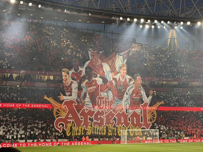 该Tifo下端写有“这是我们的地盘。(The streets are our own)”。据悉这一句歌词来源于阿森纳球迷赛前经常咏唱的歌曲《永远的北伦敦》。本场比赛前,根据英国阿森纳球迷博主Hand of Arsenal的消息,该设计由球迷推动完成,现役和退役球员都参与了设计。【上咪咕独家看英超】