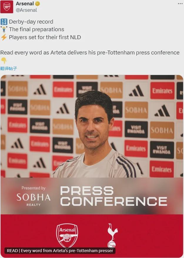 阿尔特塔出席了赛前新闻发布会,我们来看关键内容。你能直接说说加布里埃尔的伤势有多严重吗?是的,很不幸加布在国家队受伤了,他会缺阵几周时间。你能再说清楚一点吗?不能。我们还要再做一次扫描,下周三吧。到时候我们可能会比现在获得更清晰的康复时间表。卡拉菲奥里也错过了意大利的比赛,他还好吗?是的,他错过了比赛,他没法出战,我们只能把他召回来,而且他至今还未训练,所以明天我们还有一次训练课,到时候会看看他的情况。哲凯赖什、马丁内利、热苏斯、哈弗茨、马杜埃凯和厄德高呢?是的,我们在这个国际比赛日期间和医疗团队一起投入了很多精力,希望尽快让他们复出。所以明天我们还有一次训练课,到时候看看他们的感觉如何,是否能复出或者接近复出。明天我们会了解更多情况。所以他们中的有些人有希望复出?希望明天我们能迈进一步,但我显然不会告诉你。所以你能告诉我们具体哪些人能出场?我能,但我不说!曼城的比赛比你们早,如果他们赢球,那么就和你们只差1分了(奶的好),你是否感觉他们有点追上来了?没有,所有球队都在努力赢下每一场比赛,我们也一样。我们必须一场一场来,控制好自己能做的事情,为下场比赛做好准备。我们前面有一场美妙的比赛,这是我们自己能控制的。无论你决定用谁来替代加布里埃尔,这都是一个很好的机会不是吗?是的,肯定的,而且这正是我们期待的。好消息是,在一个任务繁重的赛季里,我们必须让不同的球员去踢不同的位置,而无论谁出场都必须做好准备。热苏斯的问题,他现在的恢复进展如何?非常好,他最近两周都在参加全队的所有训练。我们会在内部给他一些比赛机会,让他恢复身体状态,但总的来说热苏斯在训练中表现很好,他将成为球队一个重要的补充。据说萨卡将得到一份新合同,对你来说,他签字续约很重要吧?因为萨卡9岁就加盟了阿森纳,并且可能成为整个职业生涯都留在这里的球员:我了解到的就是,萨卡希望继续留队,他非常开心,并且想要留下跟我们一起争夺荣誉。至于续约什么时候完成,如何完成,我把这留给贝尔塔和俱乐部去解决。关于卡拉菲奥里,他目前的情况和身体负担过重有关吗?因为本赛季他踢了很多比赛,之前参加了每场英超比赛,和上赛季相比显然是好很多。所以目前关键是管理好他的身体吗?是的,他正在处理一些小问题,拉菲之前出场比赛,我们让他休息,就是因为要控制他的负荷。当天踢完最后一场比赛,去国家队时,他们已经很了解这个问题,然后就允许他回来了。关于受伤的那6名球员,对桑德兰的比赛前,你曾对他们现在复出很乐观,那么现在你是更加乐观,一样乐观,还是少了点乐观?这是最后阶段,有身体接触的阶段。我认为他们很快就会回归,但我不知道周日是不是太早。关于本怀特,他在国际比赛日之前的3场比赛都没有首发还是让人有点惊讶,尤其是客场在布拉格的比赛,难道你们还在管理他受伤之后的身体?我们经历了一个阶段,在那之后我认为现在是一个情况更好的阶段。现在我们必须根据对手来挑选出场的球员,要考虑他们之间的组合等等。所以怀特需要继续努力训练,等待机会,因为他肯定会获得机会。蒂尔尼依然在枪迷心中,而苏格兰刚刚完成了一场神奇的胜利,当你看到蒂尔尼的绝杀时,你什么感想?我为他感到非常开心,并且为所有的苏格兰人感到开心,因为我在那里生活过两年,有过令人赞叹的体验,我爱上了他们的激情和他们对待人的方式。所以我为苏格兰感到开心。以上是部分新闻发布会的内容。简单说,塔子还是不透露具体伤情,和我之前的猜测一样,依然是“下节训练课后会了解更多信息”……加布的话,塔子说会缺阵几周,但问题是几周?之前的消息说至少一个月,可能要到一月,那也是几周……总之至少一个月内是看不到加布了。塔子说正好可以使用其他球员轮换,这不假,但希望今后能主动轮换,而不是现在这样被动的……拉菲的话,不是大问题,但能不能出场也不确定。另外看塔子的意思,拉菲其实上场比赛就有轻伤了,这个情况就干脆用斯凯利了呀……拉菲上赛季伤病很多,这个赛季情况明显好转,但每场重要比赛都首发也扛不住啊……热苏斯的话,早就恢复训练了,看塔子的说法,可能会安排一些队内封闭比赛来让他找状态,这也是常规操作。热苏斯都缺阵快一年了,不会训练后就直接参加正式比赛的。一般来说这种情况可能会踢几场u21比赛,但u21直到年底可能没有比赛任务了,所以应该会安排内部封闭比赛。至于其他人,其实除了哈弗茨,应该都比较接近复出了。曼城和利物浦都输球了,所以阿森纳赢球就能扩大领先优势,抓住机会吧!这个赛季的冠军,必须收入囊中!所以枪迷不必太过敏感,上场平个桑德兰就像天塌了一样,但这个赛季的曼城也不稳,其他球队更不用说,咱们做好自己就好。萨卡的续约不会有问题的,他愿意留队,就看什么时候官宣了!怀特的话,其实我觉得记者的问题不无道理,之前连续三场比赛无法首发,这么密集的赛程,也不给廷贝尔休息下,尤其是周中的欧冠比赛,对布拉格斯拉维亚其实可以给怀特首发的……