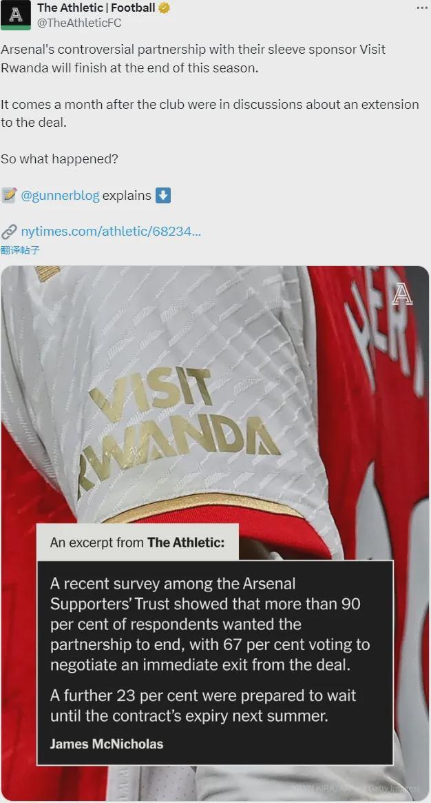 gunnerblog在TA上解释了阿森纳终止参观卢旺达袖管赞助的原因。报道称,阿森纳从“参观卢旺达”的赞助那里获得的收益是很丰厚的,俱乐部很清楚要找到一个能匹配这一财务承诺的合作伙伴将是一件很有挑战性的任务。但同时,阿森纳也担心负面新闻的影响,而且国际制裁也可能会危及这笔交易。说白了还是舆论环境问题,正如之前所说,卢旺达涉及一些地缘政治和战争,虽然这和阿森纳100%没有直接关系,但多一事不如少一事,万一屎盆子扣头上,真得不偿失。会有别的赞助商的,哪怕钱少点也没事。