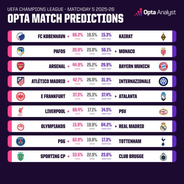 欧冠联赛阶段第5轮周四凌晨对阵01:45 哥本哈根vs阿拉木图凯拉特01:45 帕福斯vs摩纳哥04:00 阿森纳vs拜仁慕尼黑04:00 马德里竞技vs国际米兰04:00 巴黎圣日耳曼vs热刺04:00 利物浦vs埃因霍温04:00 奥林匹亚科斯vs皇家马德里04:00 里斯本竞技vs布鲁日04:00 法兰克福vs亚特兰大