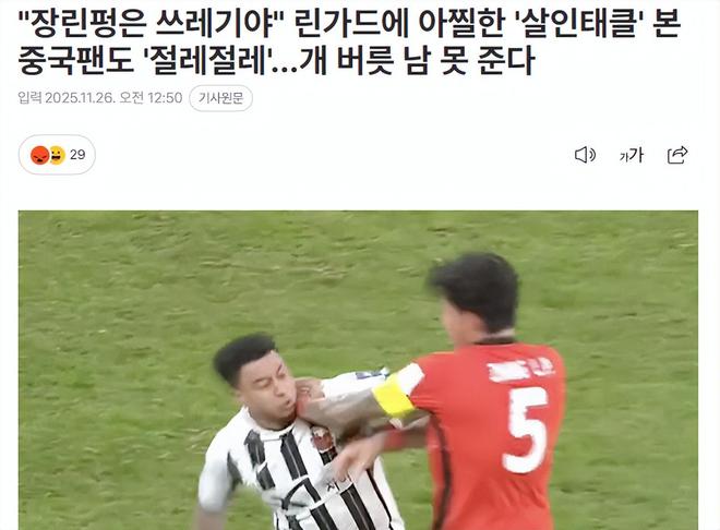 亚冠精英赛第五轮上海海港主场迎战首尔FC,这支被中超亚军主场以2比0拿下的K联赛劲旅,结果却反过来3比1战胜中超卫冕冠军。更尴尬的是,上港5轮仅拿1分,申花4轮4分,成都蓉城5轮5分,此情此景让人搞不清楚到底谁才是中超第一名,谁才是中超第二,谁才是中超第三。赛后,外媒对张琳芃的爆铲进行狠批,并嘲讽了中超冠军。韩媒对张琳芃给林加德的凶铲进行了狠批,标题大意是林加德险遭凶狠飞铲,连中国球迷看了都直摇头。文章配图有两张图片,一张是张琳芃手推林皇面部(上图)标,另一张是飞铲时的镜头(下图)。谈到张琳芃的粗暴飞铲,该文还举例2012年的亚冠联赛中他对当时全北现代后卫赵城焕恶意飞铲,导致后者重伤。文章继续表示,在中超他以联赛夺冠次数最多(11次)而闻名,但同时也因屡教不改的非绅士化比赛作风而扬名。文章最后一段写道,刚实现中超三连冠的上海海港(目前亚冠仅积1分)在亚冠精英赛中却遭遇三连败,跌至12支参赛球队的垫底位置,赛后,球队竟在主场球迷面前举行了中超夺冠的庆祝仪式,引发球迷强烈不满,纷纷指责球员“输成这样还笑得出来?脸呢!”另一韩媒发文标题大意是:林加德梅开二度却遭凶铲+面部暴力,上海再演惹怒功夫足球(下图)。文章批评张琳芃的危险凶铲有可能导致林加德受伤。谈到两人的冲突,文章表示被铲倒后,愤怒的林加德随即起身与其发生冲突,而张琳芃更是变本加厉,用拳头推搡林加德的脸部。作者认为张琳芃这是一次明显的暴力行为,若被直接红牌罚下也无话可说。当时裁判是各打五十大板,各领黄牌一张。另外关注亚洲足球的football-tribe网站也对这场比赛进行了报道(下图),标题大意是:林加德大放异彩,中超冠军颜面尽失。这篇文章高度表扬了一传两射的林加德帮助首尔FC以3比1击败中超联赛冠军,让球队在东区前五场比赛中取得八分。紧接着,文章写道:上海海港则积1分排名东亚区的小组垫底。中超三连冠的四冠王排名倒数第一,你说尴尬不尴尬?正好对了文章标题。