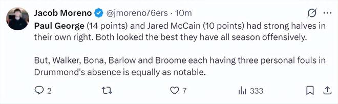 北京时间11月29日,NBA杯赛,费城以115-103击败篮网结束二连败。费城与篮网已经是无缘杯赛八强的球队,这只是一场普通的常规赛,首节费城就领先8分,半场拉开到15分,三节打完篮网缩小了3分的差距,但末节又被费城拉开。保罗-乔治轮休了一场比赛后复出,这是他本赛季打的第四场比赛,他打出了目前为止最好的上半场表现,首节4中3+三分2中1拿到7分1抢断,次节4中3+三分2中1拿到7分2篮板1助攻1抢断。费城记者盛赞乔治半场14分、魔仙哥半场10分很出色,乔治半场8中6拿14分是目前半场得分新高。第三节乔治这个手感是急转直下,单节7分钟里2中0没得分,好在马克西是复苏了单节4中2+罚球4中4拿到9分5篮板3助攻,费城四人得分上双继续领先篮网,马克西19+8+7,格兰斯15+4+3,乔治14分,魔仙哥10分。末节篮网的主力还在场,费城不敢大意继续让马克西、格兰姆斯、巴洛等人打,进入最后2分钟两队的分差还有10分以上,乔治肯定不会登场了,马克西持球推进还剩20秒耗时间不打了,比赛完结乔治21分钟拿到14分3篮板2助攻,马克西22分9篮板7助攻,格兰姆斯19分9助攻,巴洛10分9篮板4助攻,麦凯恩20分4篮板,博纳13分6篮板。