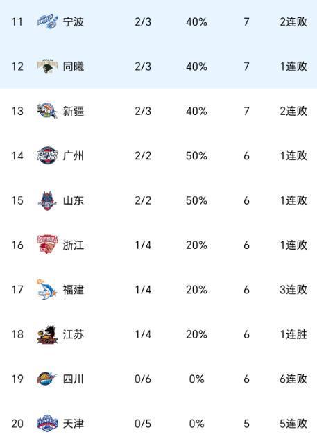 新赛季以来,战绩最差的球队当属四川队,已经连续多轮位列倒数第一,上一轮更是主场51分惨败北京队,全场仅得到46分,这是CBA历史单场第二低的得分,距离历史最低分只有1分的差距。此外,四川队也成为了CBA历史上半场得分最低的球队,仅拿到16分。这一轮,四川队前往客场挑战深圳队,首节比赛打了三分钟没有得分,被深圳队轰出一波11-0的开局,第一节结束落后11分,景菡一靠着一己之力扛起球队,打满10分钟,投篮6中5,罚球2中2,拿到12分2助攻的数据,随后第二节,四川队成功限制了深圳队得分,但也输了1分,上半场结束落后12分。下半场,四川队赢了3分,最终还是87-96不敌深圳队,遭遇开局6连败,继续排名垫底位置。数据统计,深圳队总共五人得分上双,包括贺希宁21分、王浩然18分、李慕豪17分、史密斯12分、容子峰10分,四川队也有四人得分上双,包括景菡一24分、段睿骐20分、李金效13分、张力升10分。新疆队VS青岛队。赛前,青岛队3胜1负排名第八,新疆队2胜2负排名第13位,两队上一轮比赛都是刚刚输球,急需要一场胜利摆脱困境。