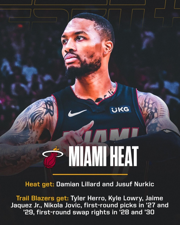 热火出:希罗、洛瑞、小海梅-哈克斯、约维奇、27年与29年首轮签,28年与30年首轮互换权。