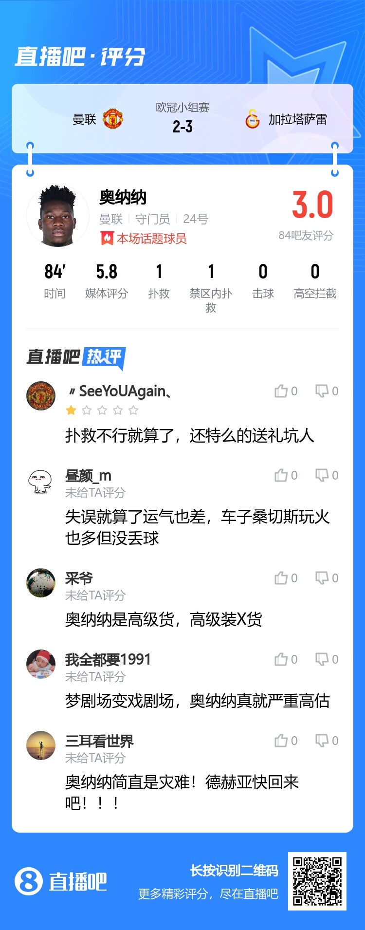 欧冠A组第2轮,曼联主场2-3不敌加拉塔萨雷,两连败垫底。奥纳纳本场表现糟糕,来看吧友在【战报评分栏】的锐评吧!